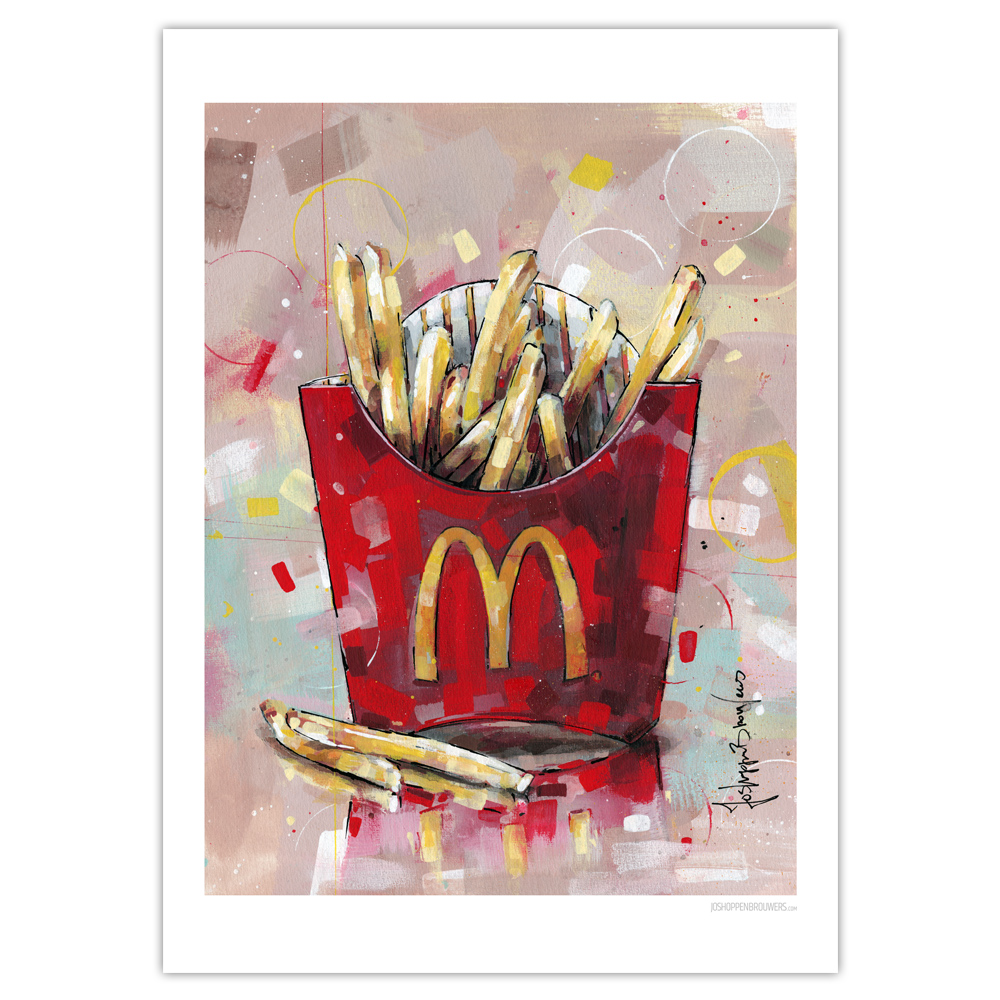 This reproduction poster features a colourful hand-painted acrylic artwork inspired by McDonald’s fries and their iconic look.