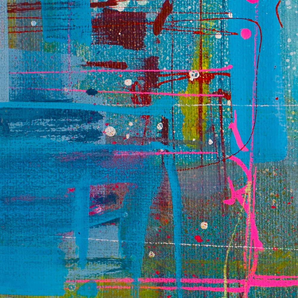The painting captures energy, movement, and a feeling of speed and excitement. Layered textures add depth and a lively, modern look to the composition.